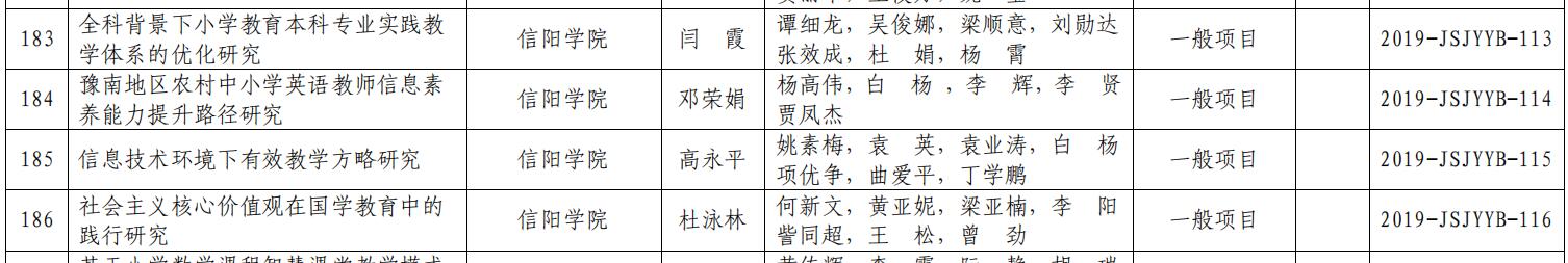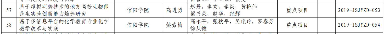 其中,高进勇主持的《基于虚拟实验技术的地方高校生物师范生实验创新能力培养研究》和姚素梅主持的《基于多信息平台的化学教育专业化学教学改革与实践》等2项获批重点项目;闫霞主持的《全科背景下小学教育本科专业实践教学体系的优化研究》、邓荣娟主持的《豫南地区农村中小学英语教师信息素养能力提升路径研究》、高永平主持的《信息技术环境下有效教学方略研究》、杜泳林主持的《社会主义核心价值观在国学教育中的践行研究》等4项获批一般项目。