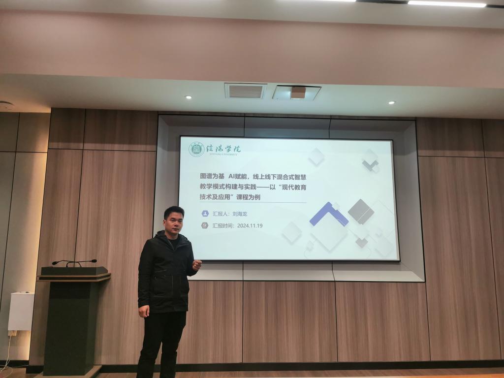 教育学教研室主任刘海龙老师担任了本次报告会的主讲教师。此次教学改革项目成果报告的题目是:图谱为基AI赋能,线上线下混合式智慧教学模式构建与实践——以“现代教育技术及应用”课程为例。刘海龙老师从教改背景、教改设计与实施、思考和未来规划三个层面详细介绍了教改项目的进展情况和成果。其中重点讲述了其教改成果,“九位一体”混合式课程教学改革体系的构建,分两个阶段进行具体的实施。第一个阶段基于“BOPPPS+翻转课堂”的线上线下混合式教学;第二阶段知识图谱助力,AIGC赋能。