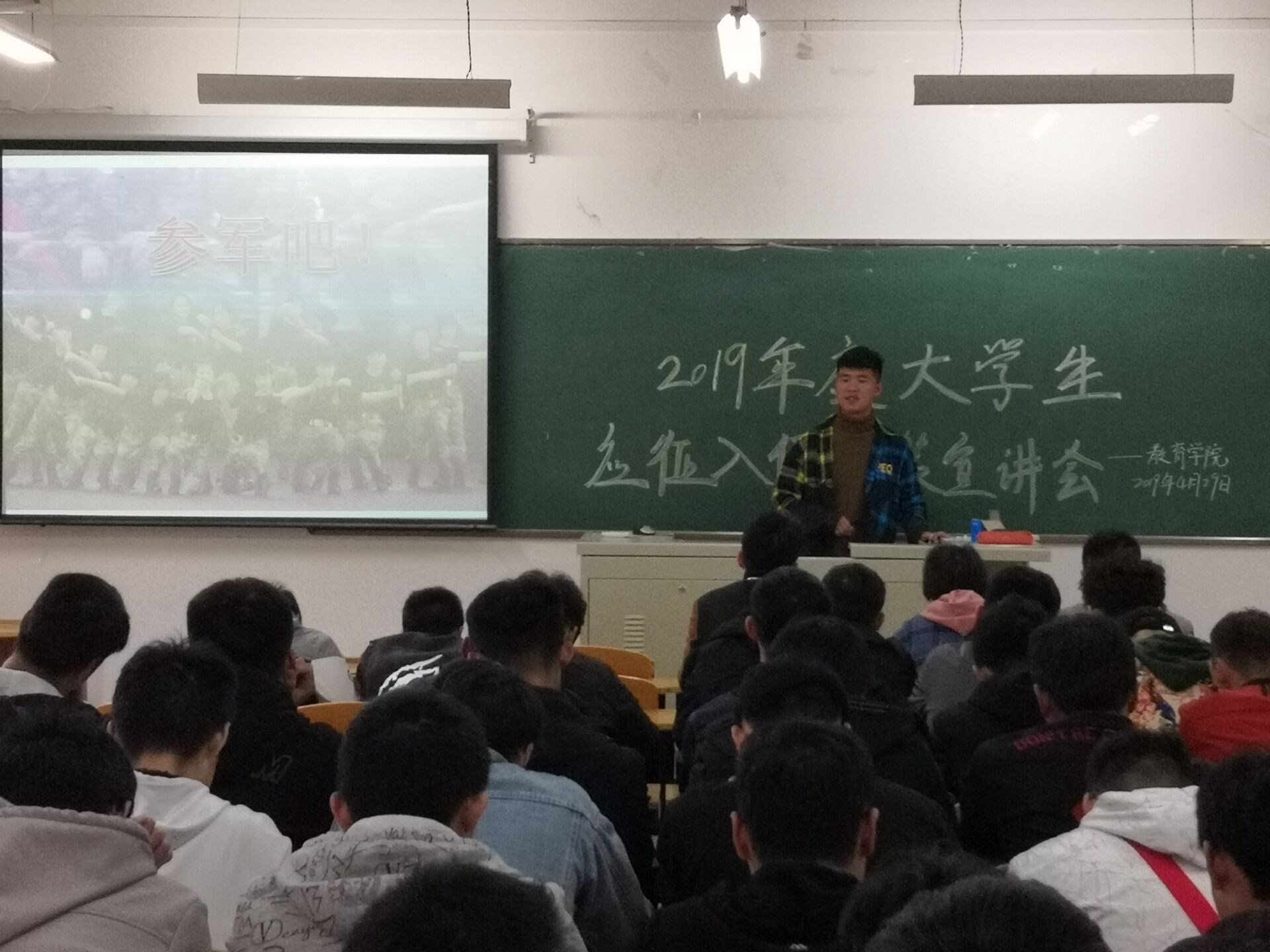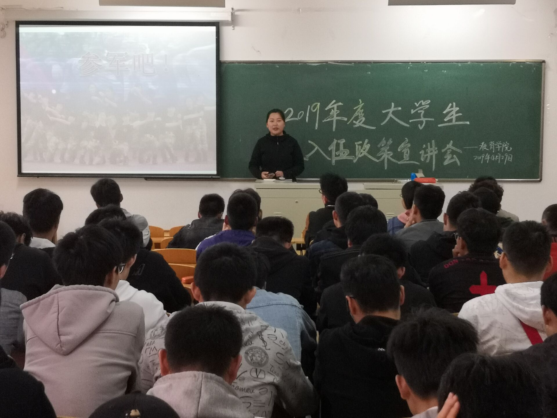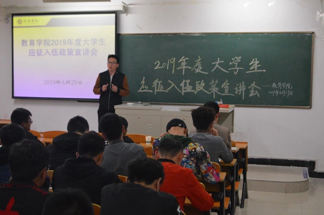 为进一步宣传大学生应征入伍政策,鼓励青年学子携笔从戎,近日,太阳集团tyc138在社科楼215教室举行2019年度大学生应征入伍政策宣讲会,会议由李进主持。太阳集团tyc138党总支书记李赟、学工秘书刘颖方和一百多名男生参加了此次宣讲会。