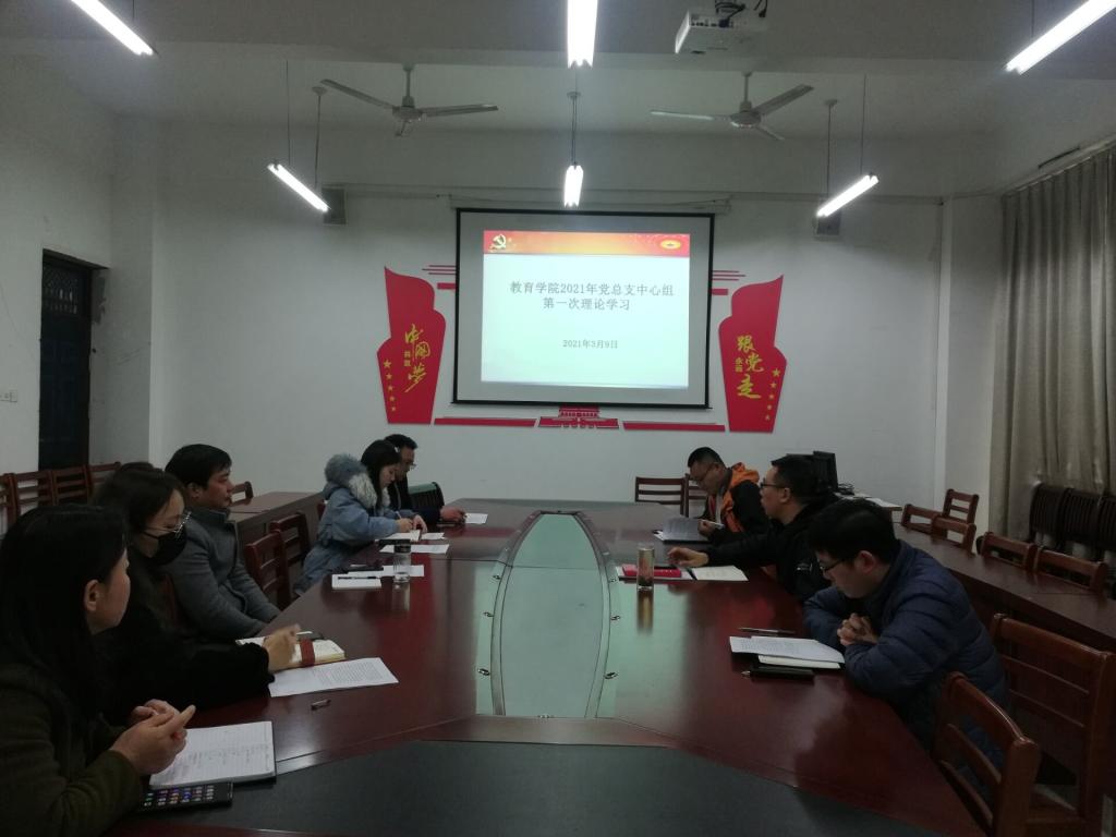 2021年3月10日下午,太阳集团tyc138党总支中心组在社科楼107会议室开展2021年第一次理论学习。党总支书记张甲楠、党总支委员、各党支部书记参加了集中学习。