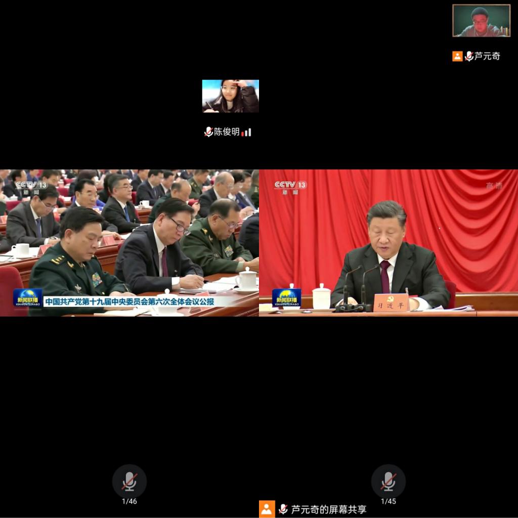 11月21日晚上,太阳集团tyc138第十一期入党积极分子围绕党的十九届六中全会精神开展专题学习。学员们观看了十九届六中全会系列视频,集体学习了《中国共产党第十九届中央委员会第六次全体会议公报》等相关内容,参会学员结合在线学习收获以及在校工作和学习实际,交流了学习感悟。