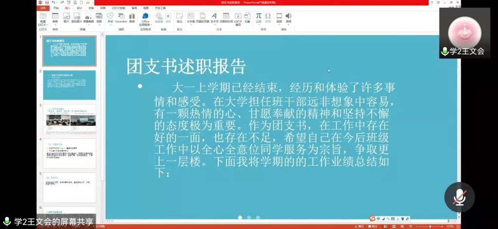会议伊始,许佳璐向大家详细介绍了本次述职报告会的目的和流程。各团支书就“班子建设、团员管理、活动开展、制度落实、作用发挥”五个方面进行年度述职总结报告。各团支书做完述职汇报后,学生会主席范文卓依次就以上团支书的汇报做出点评,指出在汇报过程、工作开展中存在的优点与缺点并针对下一年度工作提出改进措施。