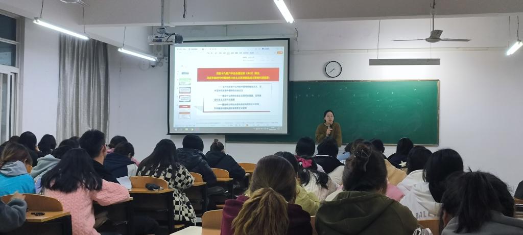 赵田田老师以“新时代新思想新飞跃”为主题,通过对中国共产党的改革、政策变化、历史使命、光辉成就等方面进行讲解。同时,讲解了“党的十三个方面成就”和“十个明确”两个重点内容。