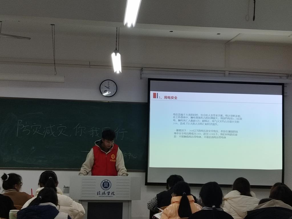 在活动之中,我院志愿者前往学院各班级开展志愿宣讲。在宣讲过程中,宣讲人认真贯彻宣讲有关要求,重点提到学校安全用电问题、学校消防安全问题、学校安全专项整治等内容,并为学生讲解了防灾减灾知识、安全常识和应急知识,其中包含地震逃生知识注意事项、预防火灾等多种安全防范常识和必要的应急防范措施,同时也通过生动的案例分析和实用的技巧讲解,让同学们深刻认识到防灾减灾的重要性,也使他们能够在遇到灾害时保持冷静、正确判断、有效自救。