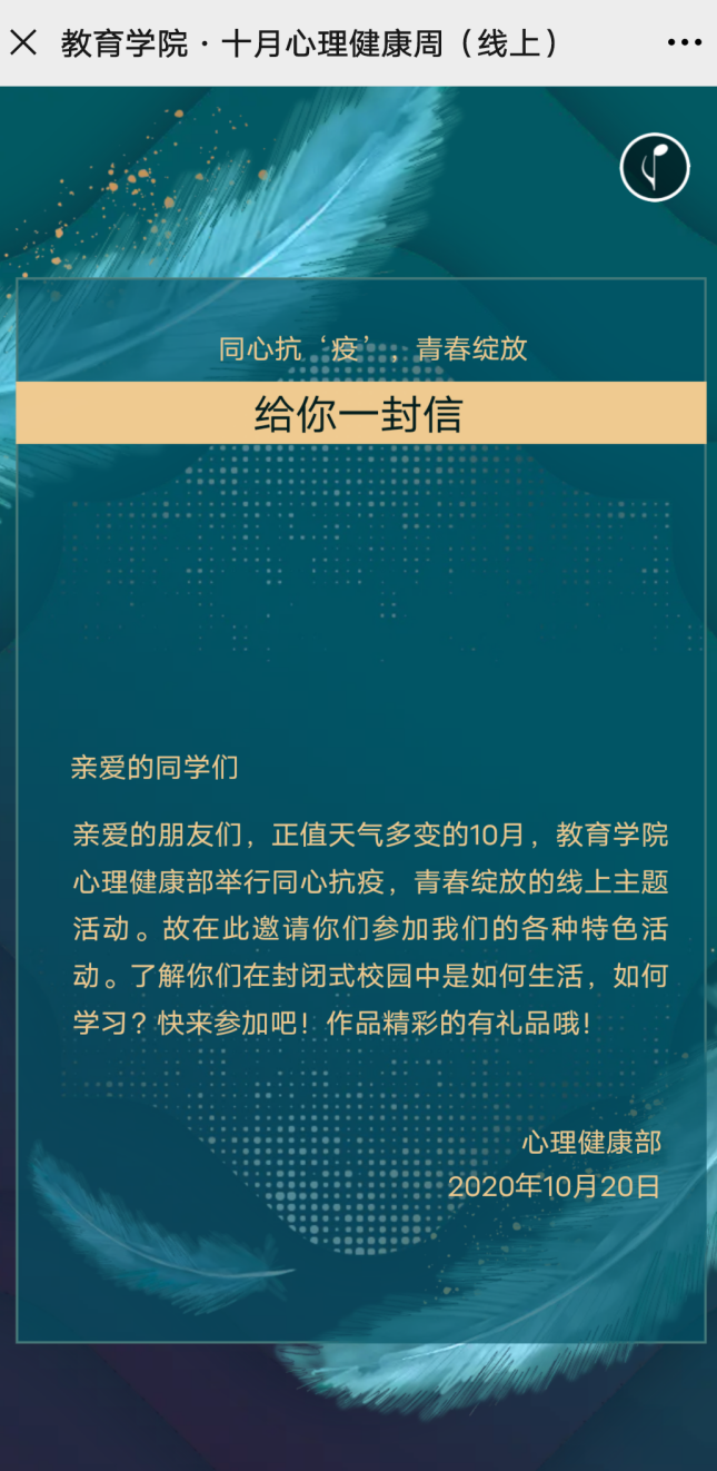 为了响应学校“同心抗‘疫’,青春绽放”心理健康周活动,太阳集团tyc138于十月份先后开展了“我心中的小幸福之怪兽涂色”“一起接龙吧!”“我和我的宿舍时光视频大赛”“心理影院”等一系列丰富多彩的活动。这些活动目的是让同学们在封闭式的管理模式下,树立健康积极的良好心态,帮助同学们掌握心理常识,提升同学们相互合作、相互关怀和分享的精神。