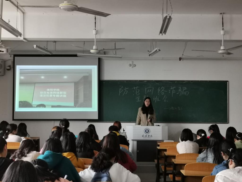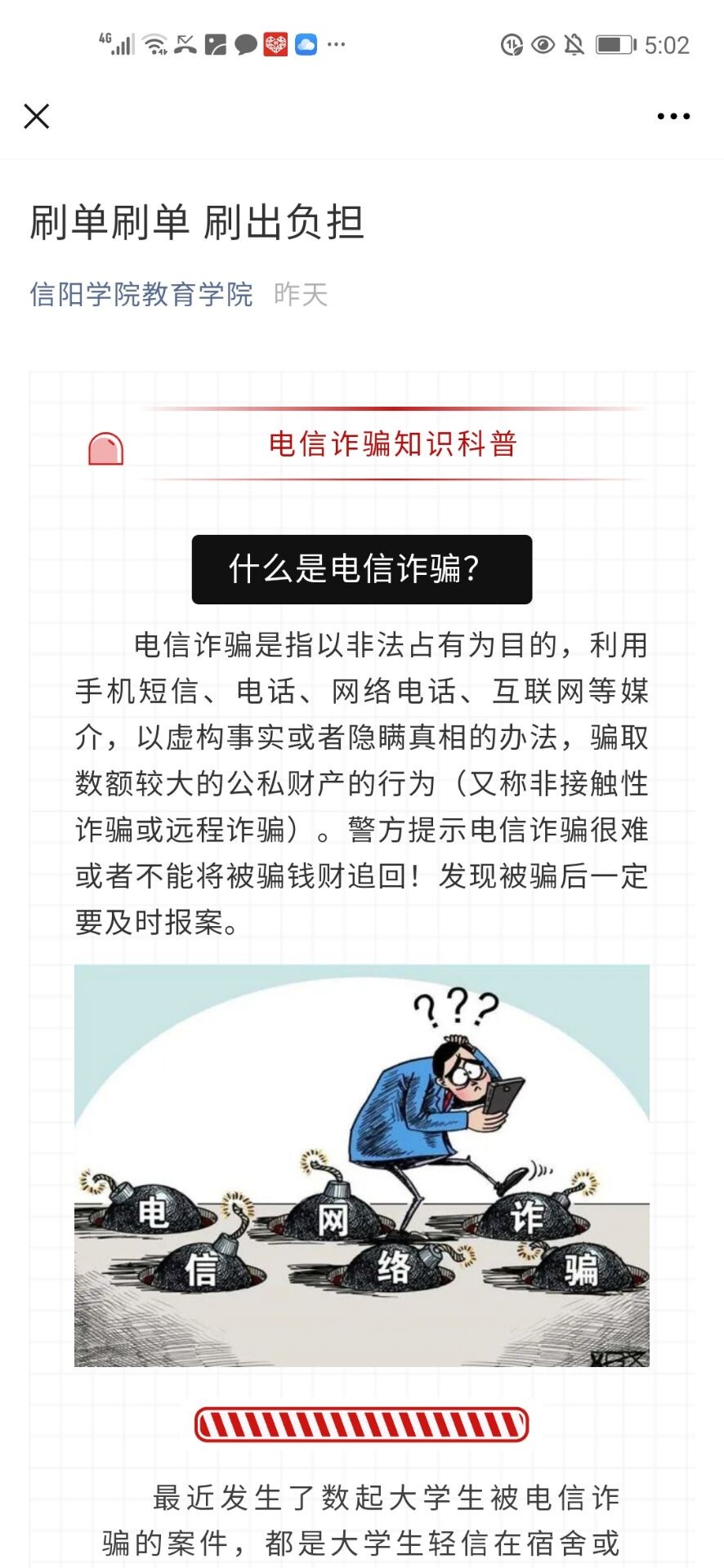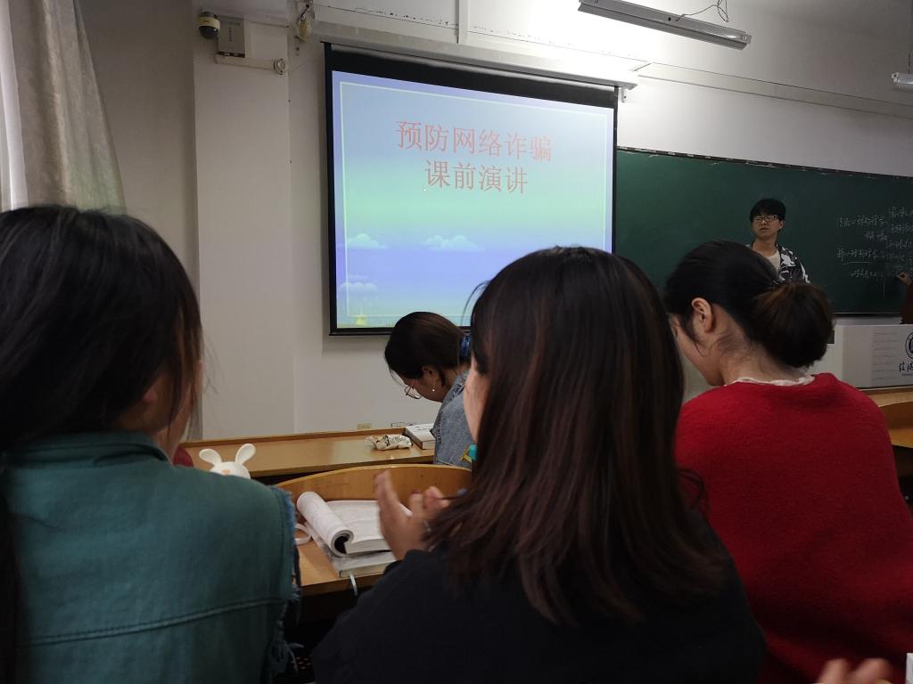 根据上级指示,学院还将预防电信网络诈骗常识印成宣传页,分发到各寝室,让学生们将宣传页张贴到宿舍显眼的位置;同时,我院采用多种方式切实提高学生防骗意识,如:组织全院学生签订承诺书,悬挂防诈宣传条幅,利用电子屏播放反诈标语,微信公众号推送相关常识,组织课前十分钟反诈演讲。