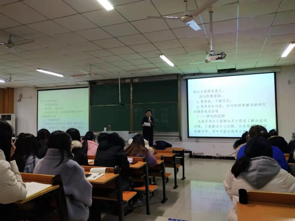 谢教授结合具体的论文指导规范,从如何选题、如何查阅文献并有效地阅读文献、撰写文献综述、如何撰写规范的开题报告、如何开展论文研究、撰写论文内容、注意论文格式等几个方面为老师和学生进行了富有实践性、指导性、学科性的讲授,有针对性地解决了老师及学生们的困惑。对于接下来的毕业论文工作的开展具有积极指导意义。