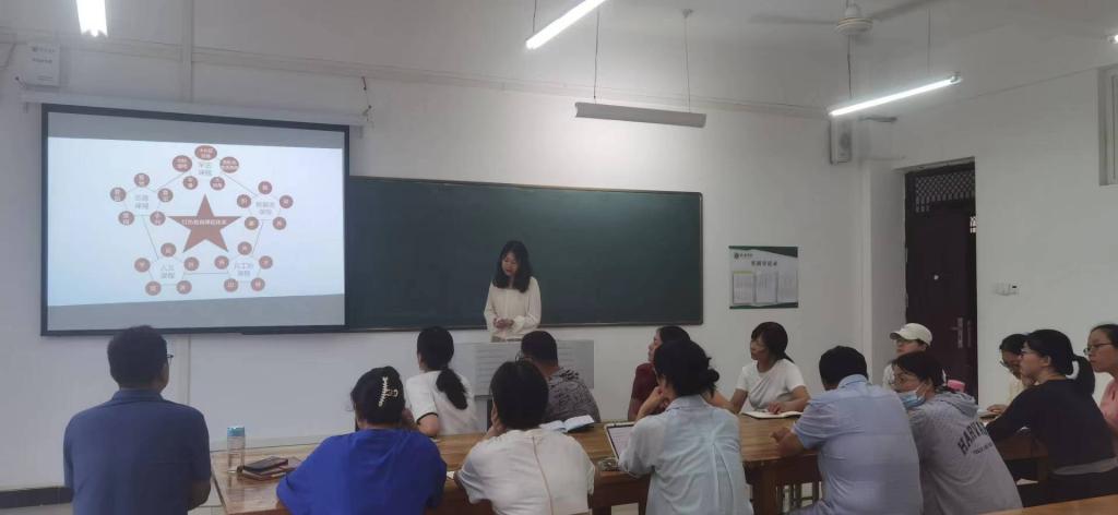 本次活动主要以教师分享研究成果为主,学前教研室王玉文教师给我们分享了近三年来的研究成果和体会,她的课题题目为《红色教育园本课程开发的个案研究》,该课题主要围绕三个方面展开,一是以郑州市X幼儿园为例,对X园办园历史进行介绍;二是从X园红色教育园本课程开发的历程进行深入挖掘,从寻文化之根—挖禀赋,找定位;探管理之法—聚合力;塑环境之本—重设施,突军味;构课程之魂—选内容,凝理念;建园本之基—做体系,供支持,三是研究取得的成绩,如制定了该园的课程体系和评价,优化了课程开发的内容;营造良好红色氛围,浸润了幼儿的精神世界;挖掘红色资源,弘扬和传承了红色文化;提高教师能力,组建了牢固的课程研发中心等等。