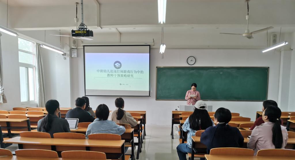 10月10日下午,学前教育教研室在社科楼403教室召开了第二次教研活动,学前教育教研室和艺术教育教研室全体教师参加了此次研讨会。本次活动主要以教师分享交流研究成果为主,朱芸老师为大家分享了近三年来的研究成果和体会,课题名称为“中班幼儿追逐打闹游戏行为中的教师干预策略研究”。