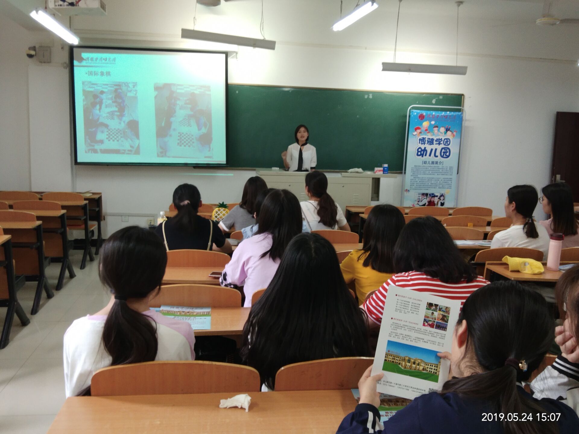该负责人首先介绍了博雅幼儿园园内概况。她说,该园教学模式按照思想–表达–实现的引导方式,激发幼儿学习兴趣、启迪幼儿思考和传递爱心,提出了兴趣发展快乐成长的教育理念,要尊重儿童自身特点,从而促进儿童全面发展;进而介绍了博雅学园人,在园内,老师是孩子的支持者,合作者,引导者。随后她介绍了园内主题课程,包括钢琴,足球,非洲鼓,国际象棋等,最后向大家介绍了博雅的福利和薪资,表示非常欢迎学前教育专业的同学前去实习、就业。