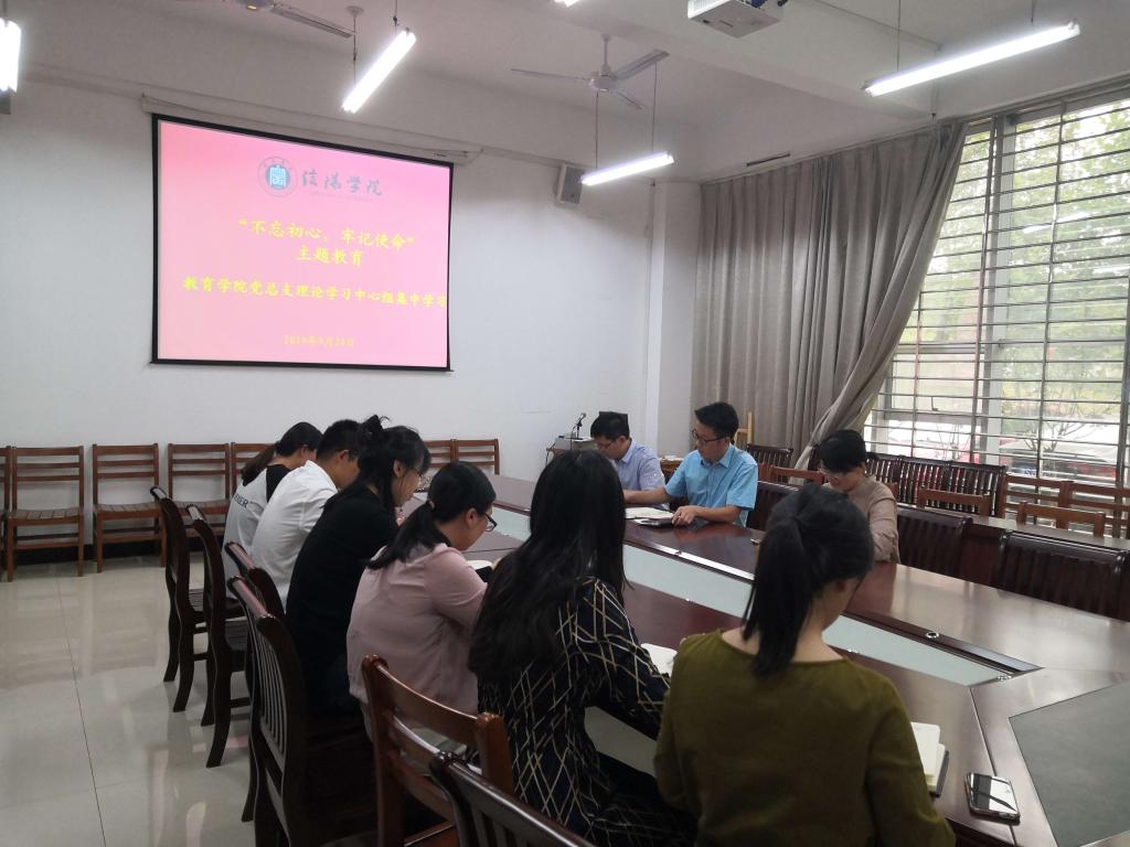 9月24日下午,太阳集团tyc138党总支在社科楼107会议室召开“不忘初心,牢记使命”主题教育学习活动,党总支书记李赟、各教工和学生党支部书记以及全体辅导员参加学习活动,活动由李赟主持。