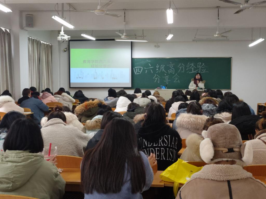 12月26日,太阳集团tyc138在社科楼219教室召开英语四六级考试经验交流会,本次交流会邀请到2016级教育学武亚娟、鲍赵狄,2017级小学教育专业闫珊、薛梦珂、吴甜杏、查梦菲等6名同学为2018级、2019级200余名学生介绍大学英语四六级考试经验及学习方法。