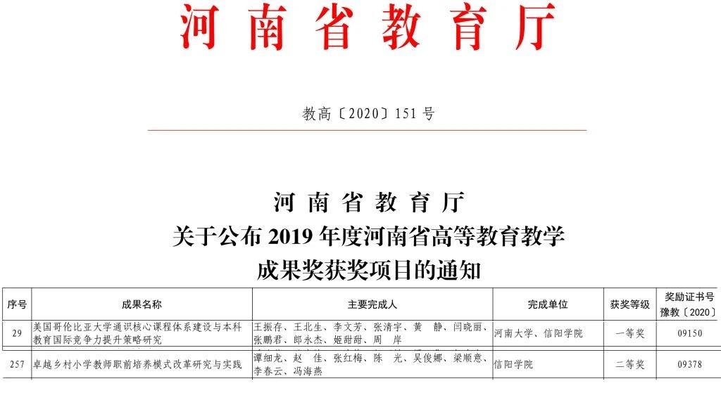 近日,河南省教育厅下发了《关于公布2019年度河南省高等教育教学成果奖获奖项目的通知》(教高〔2020〕151号),我院教师谭细龙主持申报的《卓越乡村小学教师职前培养模式改革研究与实践》项目荣获教学成果二等奖;我院教师闫晓丽参与的《美国哥伦比亚大学通识核心课程体系建设与本科教育国际竞争力提升策略研究》项目荣获一等奖。
