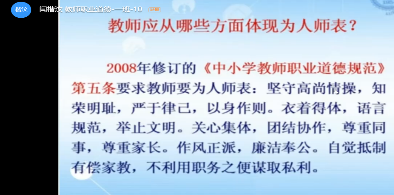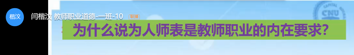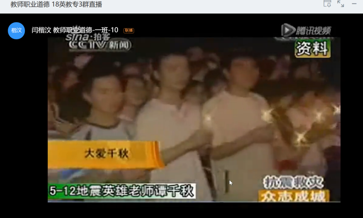 教师职业道德与专业发展:本周所讲内容为为人师表:教师职业的内在要求。本次课偏向更贴切学生未来职业选择,将课程内容与学生的自身经历相结合,(下载了谭千秋、殷雪梅等视频)帮助他们来理解相关知识点。