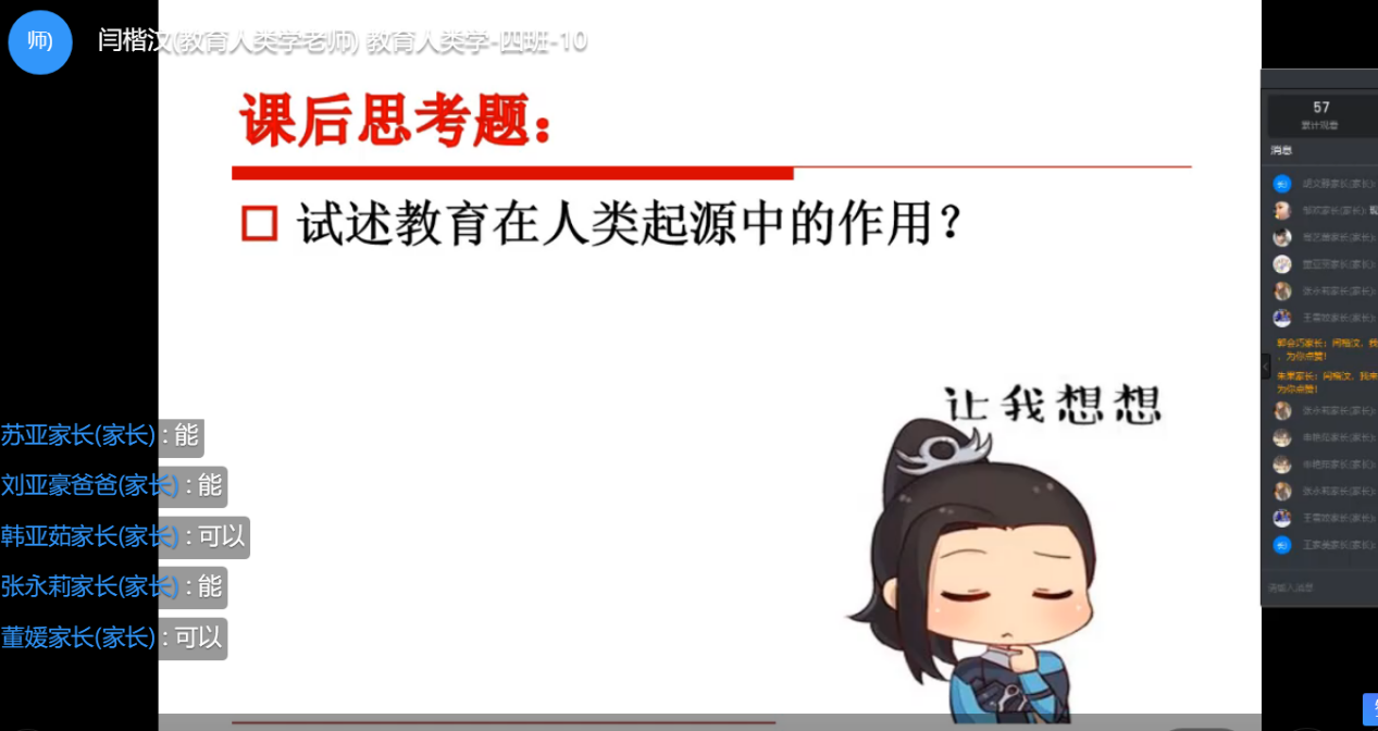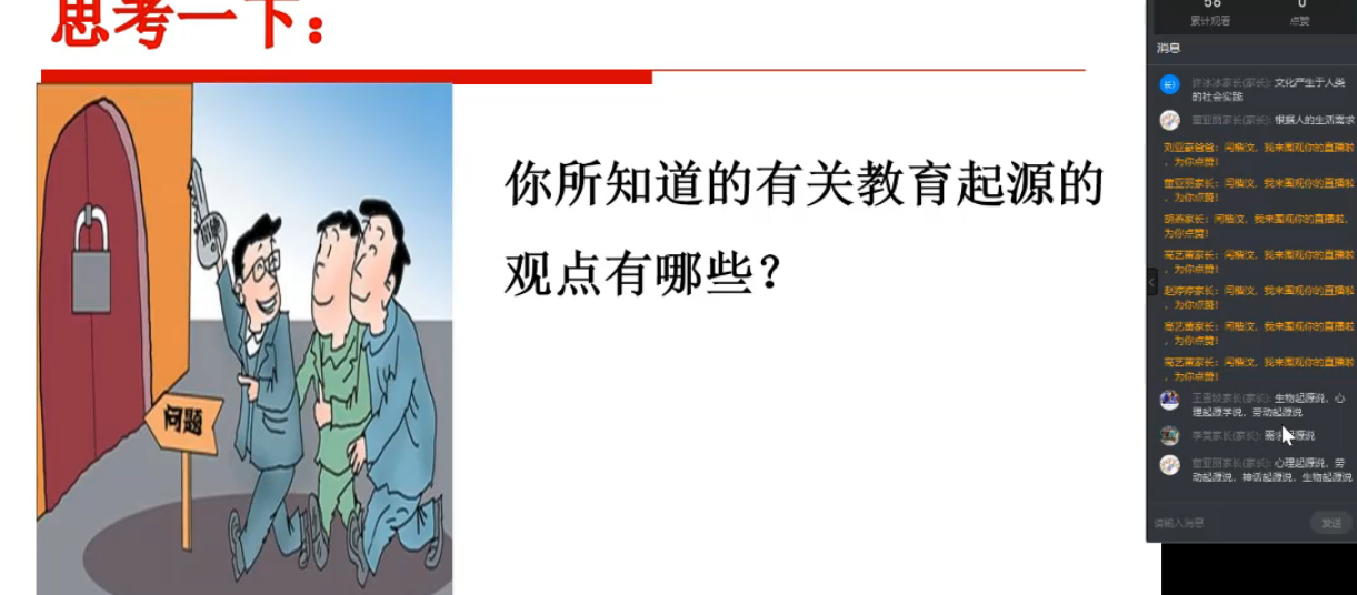 (3)在讲授“人的起源与教育起源研究”的时候,设置两个问题即“你所知道的人类起源有哪些观点?”和“你所知道的教育起源有哪些?”来展开讲授并进行总结。
