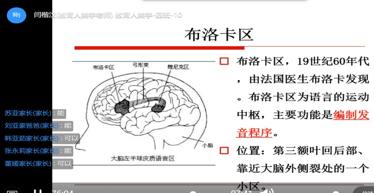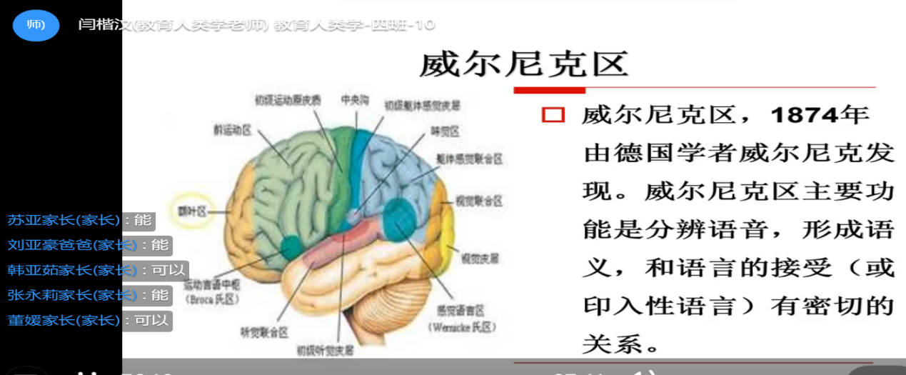 (6)在讲授“语言的产生与教育对人类起源的作用”中,结合心理学的“威尔尼克区”和“布洛卡区”的相关知识帮助学生理解语言的生理机制.