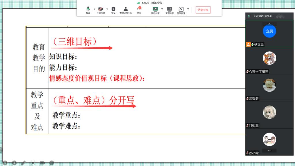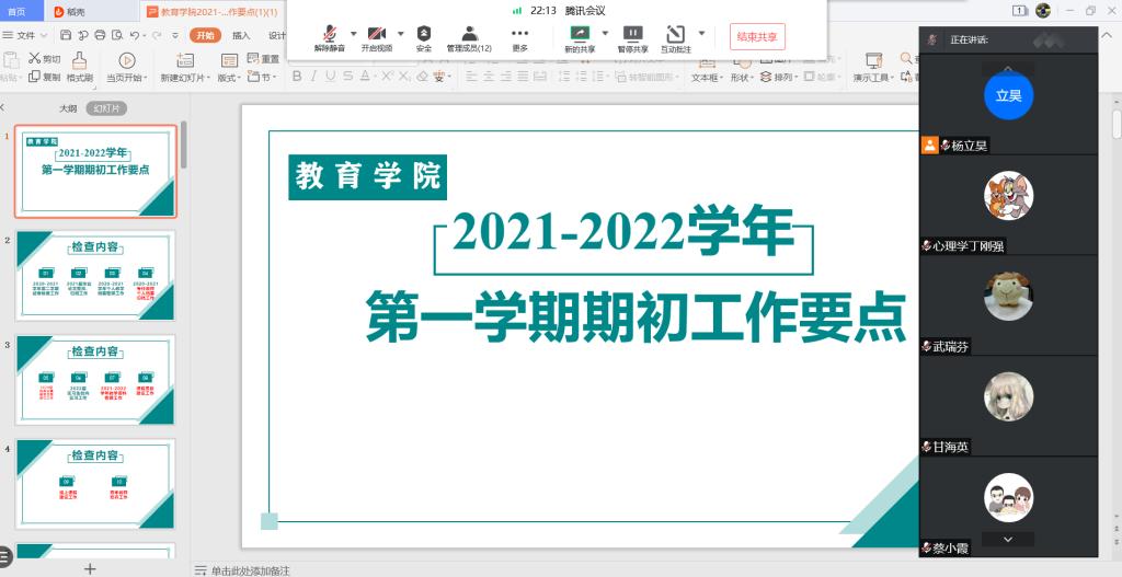 9月17日,为了直观呈现2021-2022学年第一学期期初工作要点的PPT,心理学教研室通过腾讯会议,学习了解了试卷核查工作,2021届毕业论文整改、归档工作,2020-2021学年个人教学档案整理工作,2020-2021专任教师个人档案归档工作,2020版教学大纲修订工作,2022届实习生校内实习工作,2021-2022学年教学材料整理工作,课程思政建设工作,线上课程建设工作,青年教师培养工作。并重点强调了教学大纲中课程目标:了解、理解、掌握是递进关系,顺序要有先后;不能有“使学生”、“让学生”“帮助学生”等字眼。教学设计中互动过程要与教学方法和教学手段相呼应,在教师教学档案中应鲜明地体现出思政元素。教学大纲、教学设计(教学目标、教学过程、课后反思)等均应呈现思政内容。