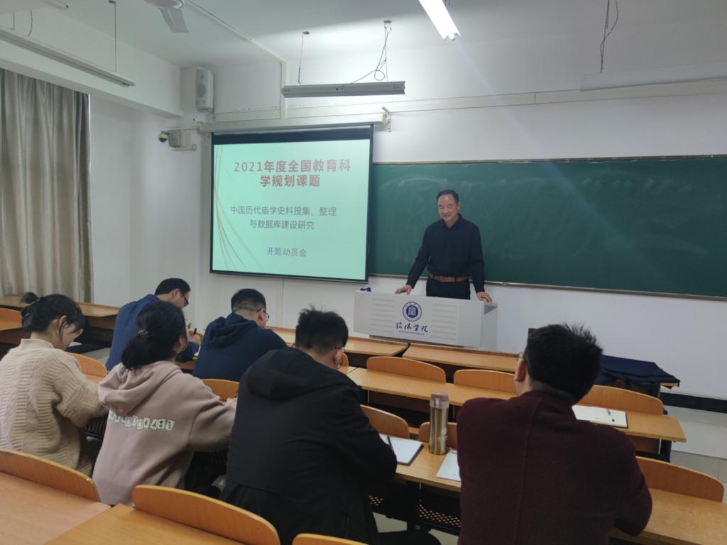 11月2日下午16:30,由ok138cn太阳集团中国庙学研究中心举办的2021年度全国教育科学规划(国家一般)项目“中国历代庙学史料搜集、整理与数据库建设研究”课题组开题动员会在社科楼306教室举行。学院特聘教授、学术带头人、硕士生导师、中国庙学研究中心主任赵国权教授主持动员会,中国庙学研究中心成员梁修振、冯海燕、胡天银、刘海龙、陈祥兰、吴春宣、郭松、常顺利等参加了此次会议。