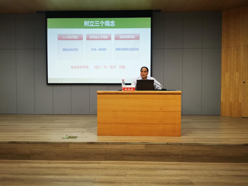 报告中,王北生从汲取三学之力,推进学校事业高质量发展;为学为事为人,努力成为“大先生”;发扬榜样示范作用,给教师的十条建议等三个方面做了全面深刻的阐述,特别是如何做好教师这个职业成为“大先生”,给大家做了详细的解读:一是要有理想信念,二是要经师、人师相统一,三是要有未来教育与人才意识,四是要教学科研相结合,五是要把握教师专业发展规律,六是要追求教学方法与艺术。