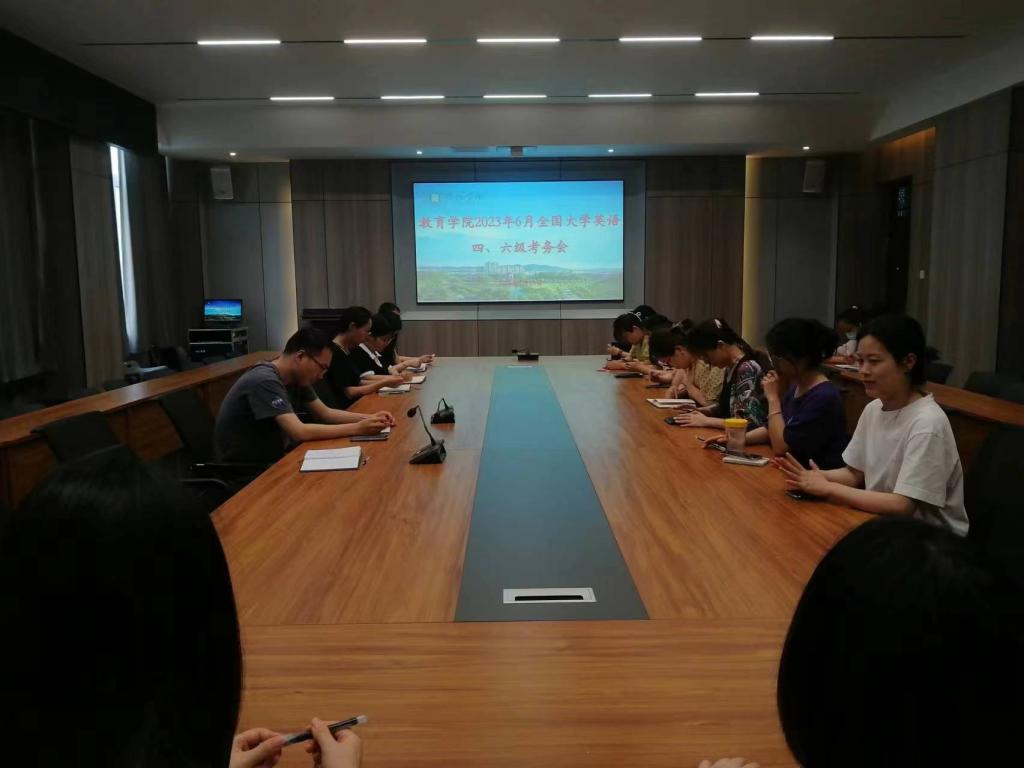 2023年6月13日下午,太阳集团tyc138在社科楼109召开了2023年上半年全国大学英语四六级考试监考考务会,教学干事徐西良、教务员崔浩以及全体监考教师参加了会议。