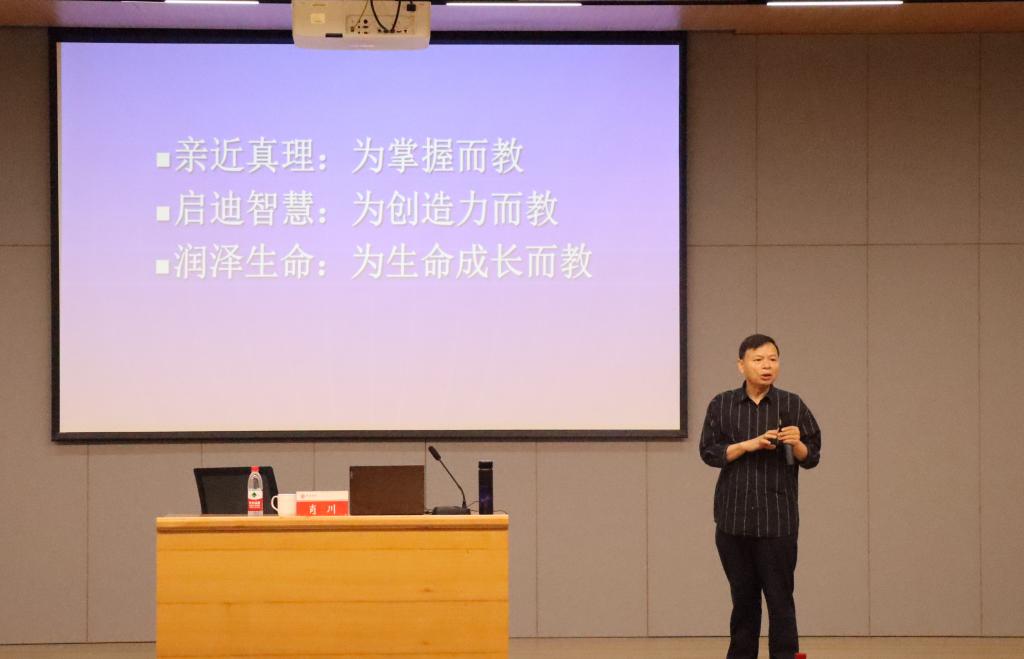 在报告的第二阶段,肖教授结合自身体会,表达了自己对幸福人生的理解,他谈到,人生努力的方向就是让自己幸福,也让他人幸福。作为教师,应当为学生的幸福生活奠基。而想要向幸福生活迈进,成长是我们永恒的主题,成长需要持续的学习。同时肖教授还分享了自己的成长经验:一是深度阅读,注重积累;二是细腻思考,精当表达;三是坚持写作,掘井及泉。