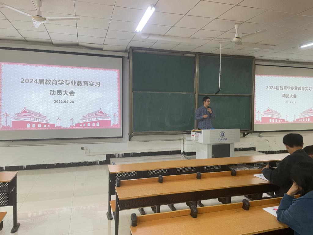9月28日中午,教育学教研室组织在社科楼112开展了2024届教育学专业教育实习动员大会。2020级教育学专业本科1-3班全体学生参加了本次动员会,会议由刘勋达老师主持并主讲。