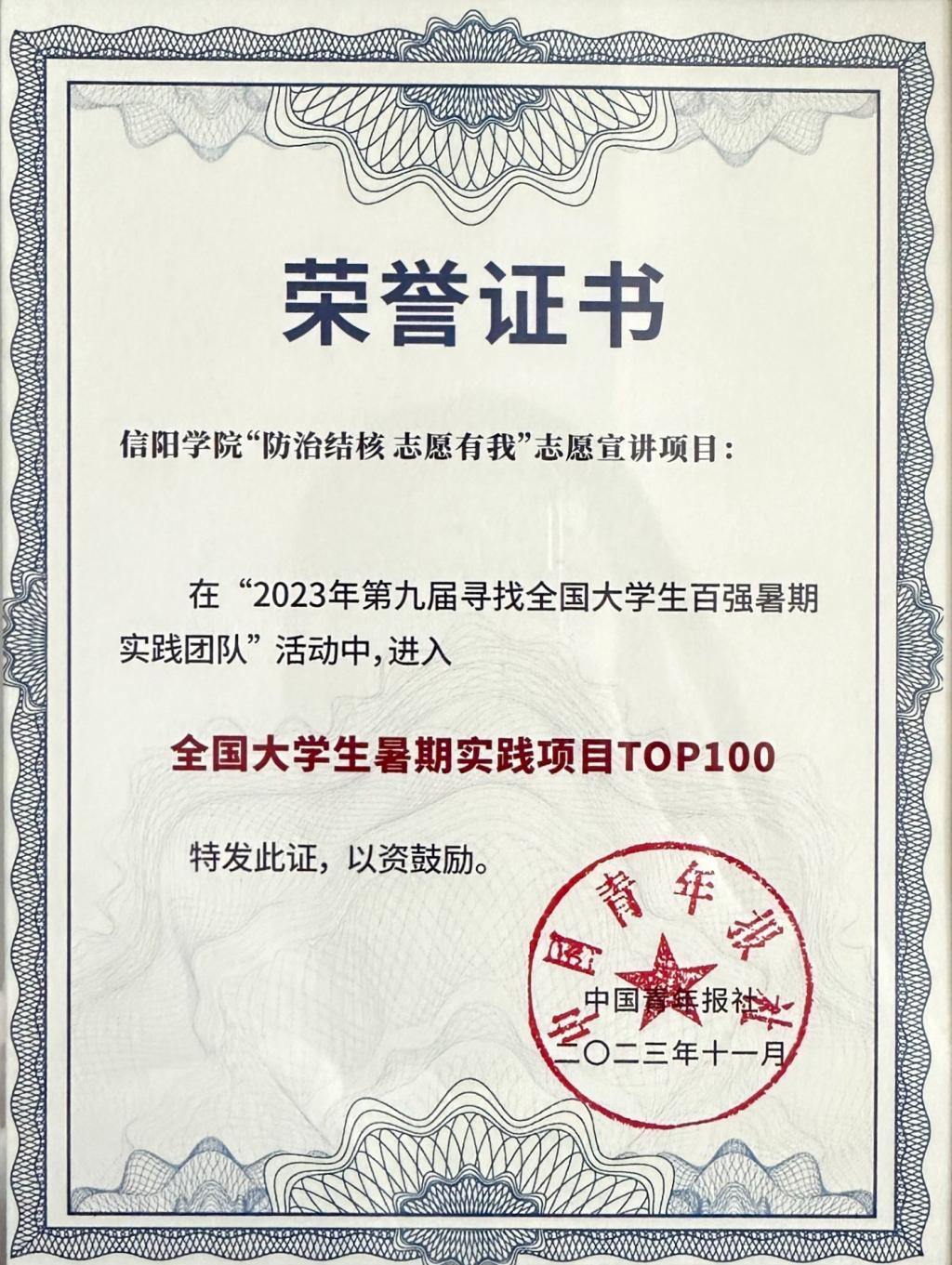 近日,中国青年报公布了“2023年第九届全国大学生暑期实践展示活动”优秀学校团队名单,太阳集团tyc138“防治结核,志愿有我”暑期社会实践团队,获评全国大学生暑期实践百强项目。并于11月20日至23日,在中国人民警察大学开展了成果展示、交流及颁奖活动,太阳集团tyc138团总支负责人及该团队负责人参加了颁奖典礼。