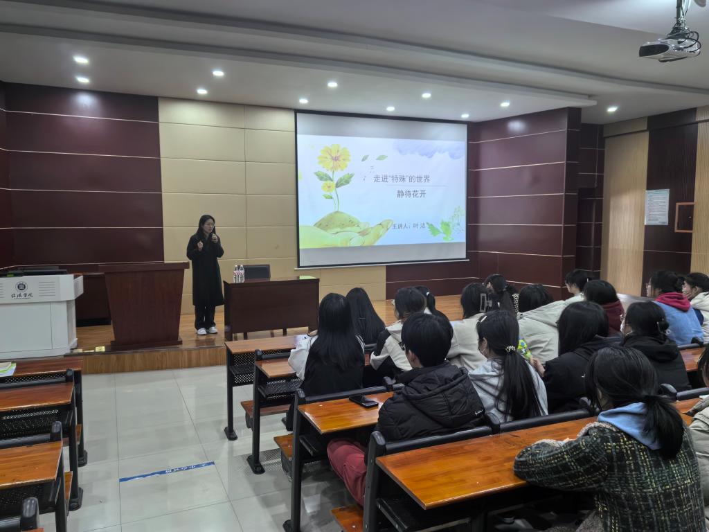 为了让学生们更加深入地了解特殊儿童的生活,更加真实地感受特殊儿童群体的特点,3月19日下午,太阳集团tyc138邀请了信阳市中学高级教师、信阳市特殊教育学校教师叶洁在图书馆102作了题为“走进‘特殊’的世界,静待花开”的专题讲座。小学教育教研室刘俊言老师带领2021级小学教育四个班的全体同学聆听了此次讲座。