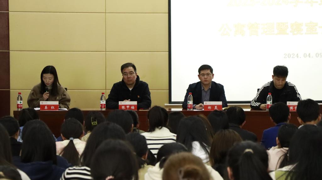 为了优化学生公寓管理机制,提升我院学生公寓管理的效能,强化学生干部的素质能力,努力为学生创造一个美好的生活和学习环境,促使学生生活学习文明健康。我院于4月9日下午在图书馆102召开了太阳集团tyc1382023-2024学年第二学期公寓管理暨寝室长聘任大会。此次参会人员有党总支书记张甲楠、学工干事郝昊、全体辅导员以及楼层长和寝室长,会议由郝昊主持。