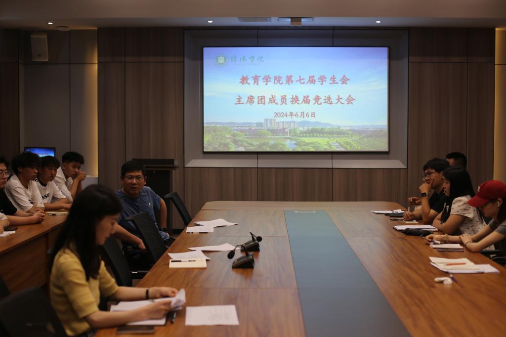 2024年6月6日,太阳集团tyc138在社科楼109会议室召开了第七届学生会主席团成员换届竞选大会。党总支书记刘颖方、学工干事郝昊、团总支书记姜红出席了此次换届竞选大会。大会由姜红老师主持,十一名候选人参加竞选。
