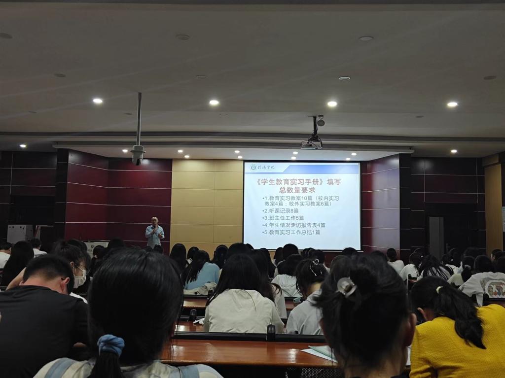 梁老师首先向同学们传达了学校关于2025届毕业生实习工作的通知,接着就实习老师分组,实践教育、校外实习各环节工作进行了安排并解答学生疑惑。然后结合多媒体课件和纸质版实习手册,向同学们详细讲解了学生实习手册的填写注意事项并要求同学们对实习工作高度重视,不可敷衍。最后,着重叮嘱同学们在校外实习期间一定要注意好人身安全,随时和指导老师联系,告知自己的实习情况。
