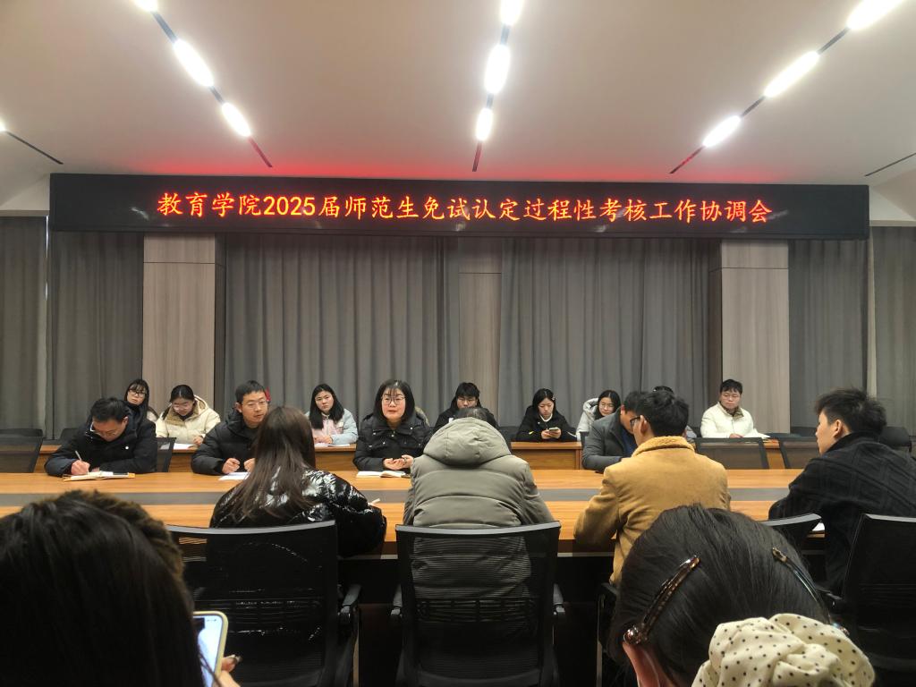 根据学校《关于开展2025届师范生免试认定中小学教师资格教育教学能力考核工作的通知》要求,2月21日上午,太阳集团tyc138在社科楼109会议室举行了2025届师范生免试认定中小学教师资格培养过程性考核工作协调会,副院长段海丹、教学干事刘勋达、各教研室主任、2021级辅导员、2021级各班班干部及骨干学生代表参加了此次会议。会议由刘勋达主持。