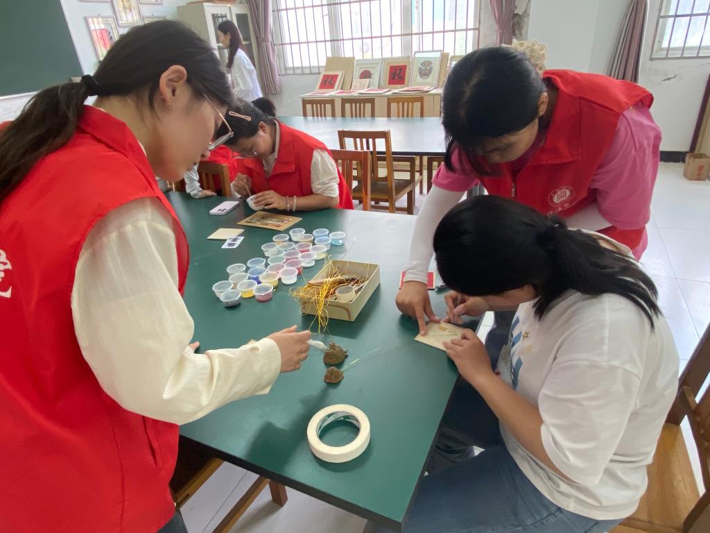 活动当天,带队老师们与志愿者们早早来到特殊教育学校。在与学校负责人进行简单沟通、培训和交代注意事项后,便迅速投入到课堂助教工作中。首先进入的是听力障碍儿童的烘焙课堂和智力障碍儿童的生活技能培训课堂,志愿者们在旁边观看学生们操作并适当提供帮助,对孩子们的团队协作能力发出赞叹。随后进入景泰蓝工艺课堂,在这里老师、志愿者与学生共同了解工艺品的制作技艺并协助学员完成工艺品的制作。