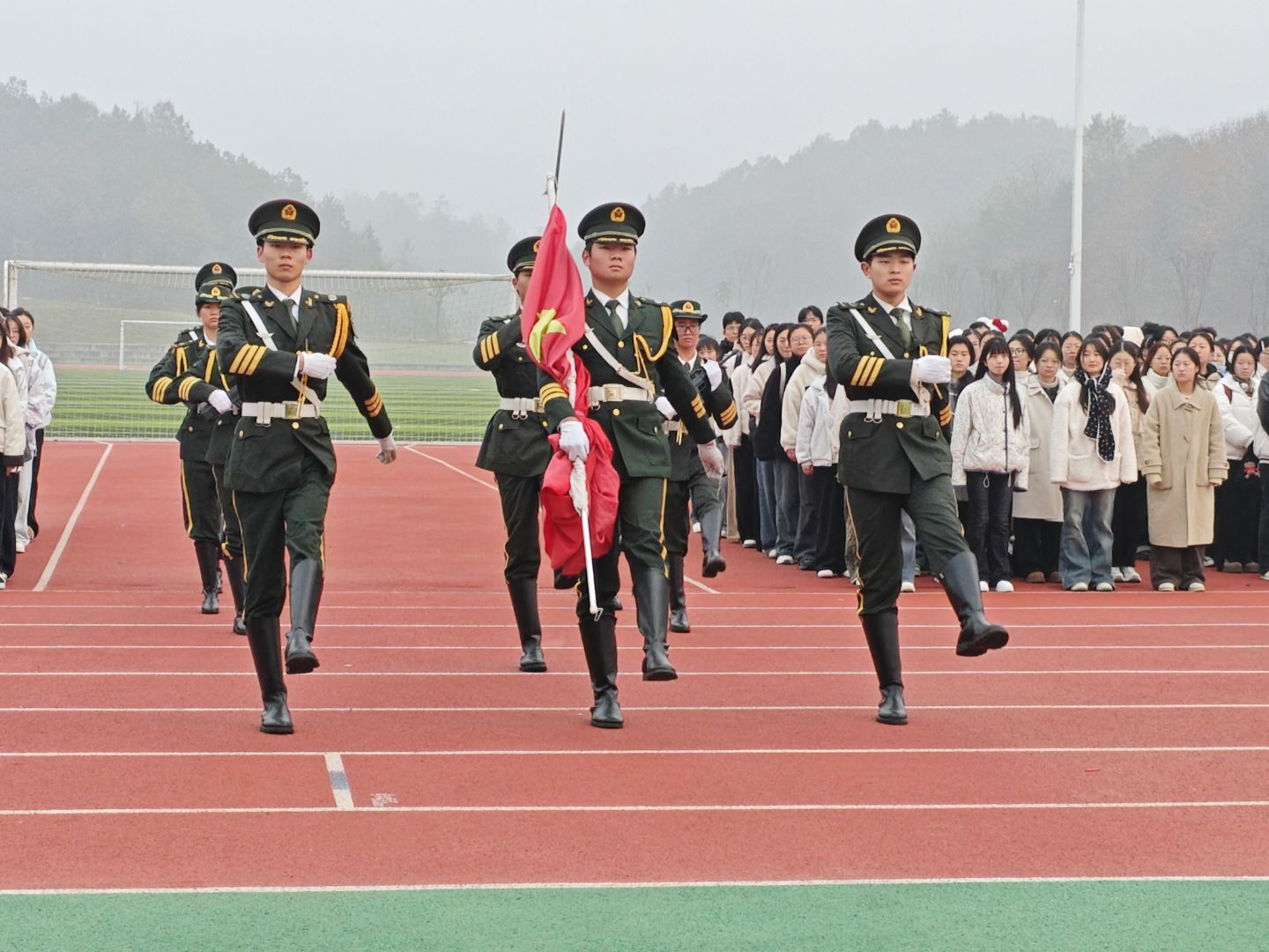为把爱国情、强国志、报国行融入血脉,以英雄模范为榜样,汇聚磅礴力量,11月10日清晨7时,太阳集团tyc138在南湖校区田径场升旗台举行以“致敬平凡英雄,守护岁月静好”为主题的升旗仪式。2022级同学们和辅导员老师们参加了本次升旗仪式。