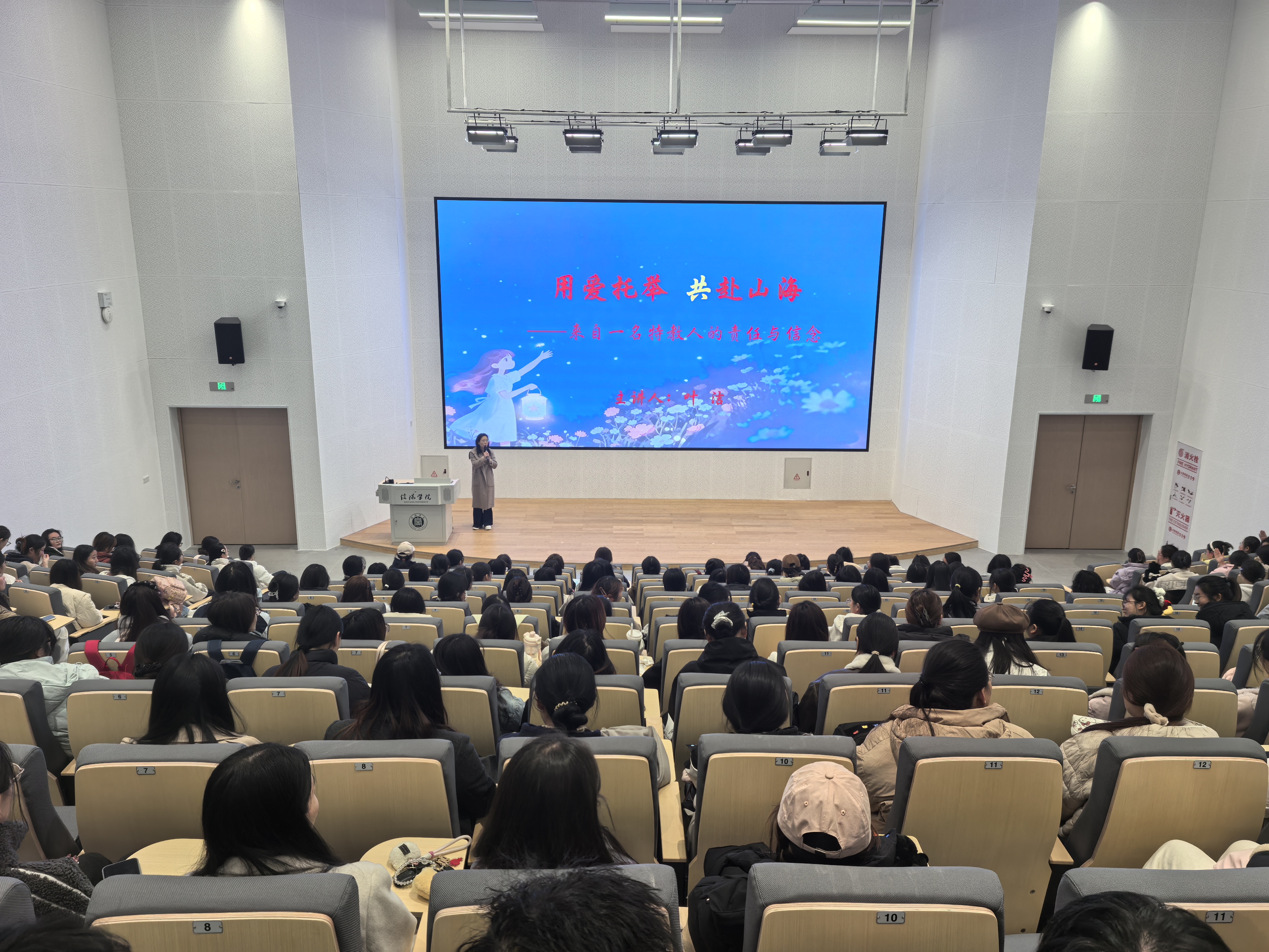 为增强我院小学教育学生对特殊教育领域的认知,强化专业教育,11月25日下午,我院在教三楼005报告厅举办了以“用爱托举,共赴山海”为主题的特殊教育学术讲座。本次讲座邀请了从事特教行业十余年,一直致力于残障生职业教育,有丰富的特教一线教育教学经验的叶洁老师主讲。2023级小学教育专业学生到场聆听了报告。刘俊言老师主持了报告。