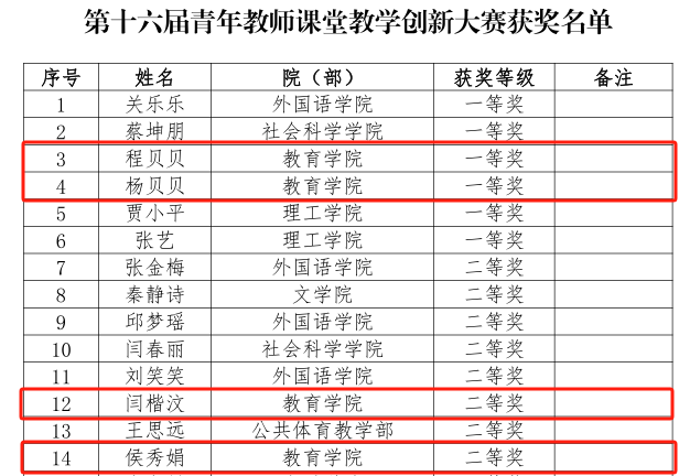 近日,ok138cn太阳集团第十六届青年教师课堂教学创新大赛落下帷幕,在教师教学发展中心公布的获奖名单中,我院参赛的4位青年教师程贝贝和杨贝贝荣获一等奖,闫楷汶和侯秀娟荣获二等奖。