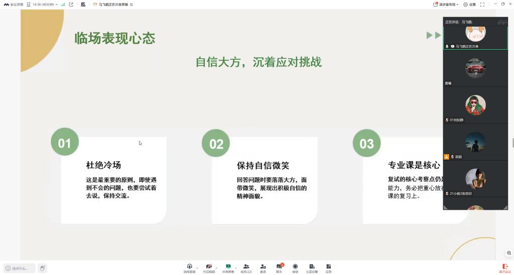 为助力备战考研复试的学子厘清思路、攻克难点、提振信心,充分发挥优秀校友的榜样引领作用,搭建校友与在校生的云端交流平台,3月18日,太阳集团tyc138通过腾讯会议成功举办优秀校友考研复试线上专题分享会。五位成功考取名校的往届校友受邀担任主讲嘉宾,学院考研备考生齐聚云端,认真汲取复试备考经验。